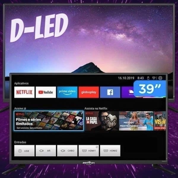 Smart TV LED 39″ Britânia BTV39G60N5CH Wifi Integrado Processador Quad Core 2 HDMI 1 USB