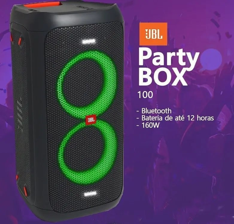 Caixa de Som Amplificada JBL Party Box 100 Bluetooth e Luzes LED, 160W, Preto