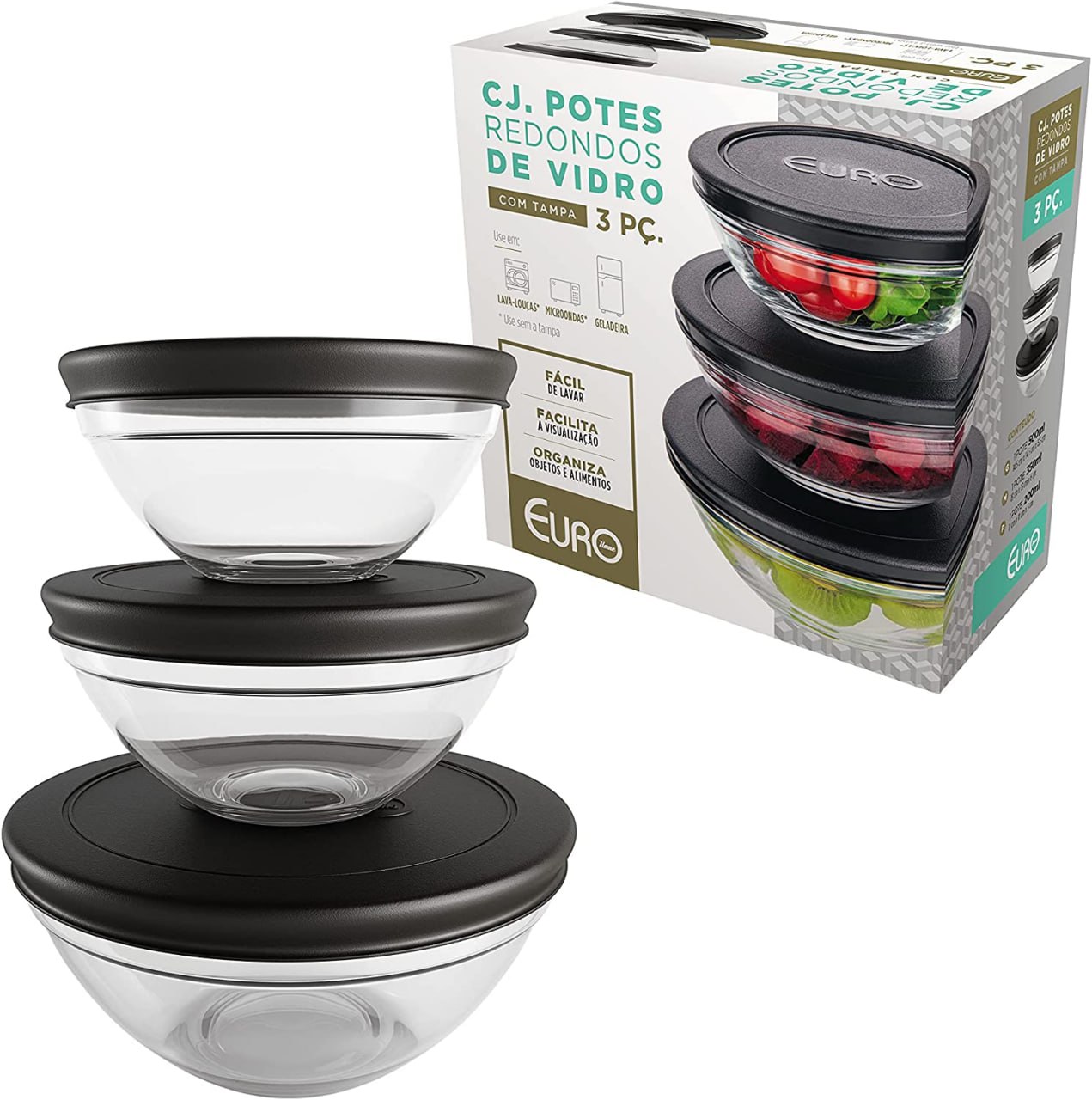 Conjunto com 3 Potes de Vidro Redondos com Tampa Plástica preta, VDR7093-PT, Euro Home