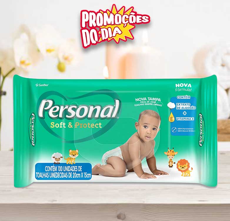 Toalhas Umedecidas Soft and Protect, Personal, 100 unidades, Branco