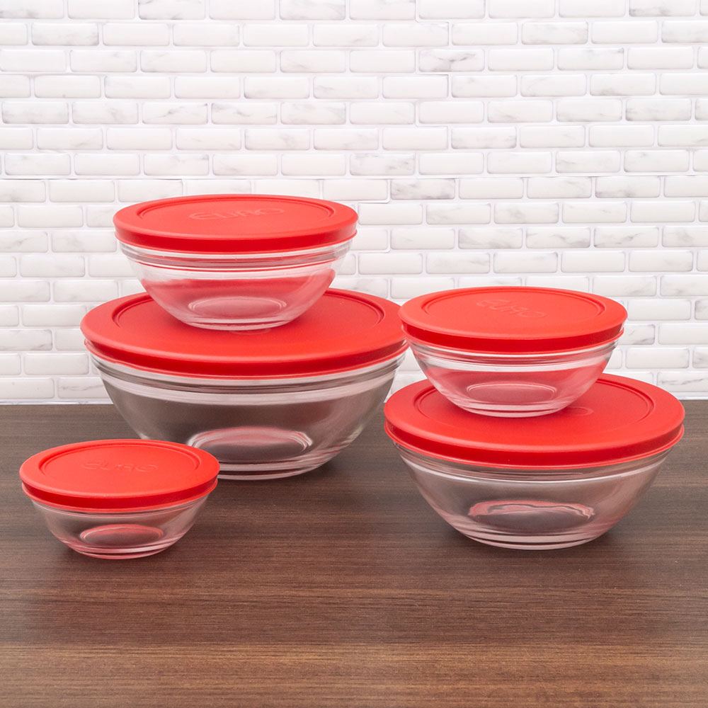 Conjunto de Potes de Vidro Redondos com Tampa Plástica 5 Peças Euro Vermelho