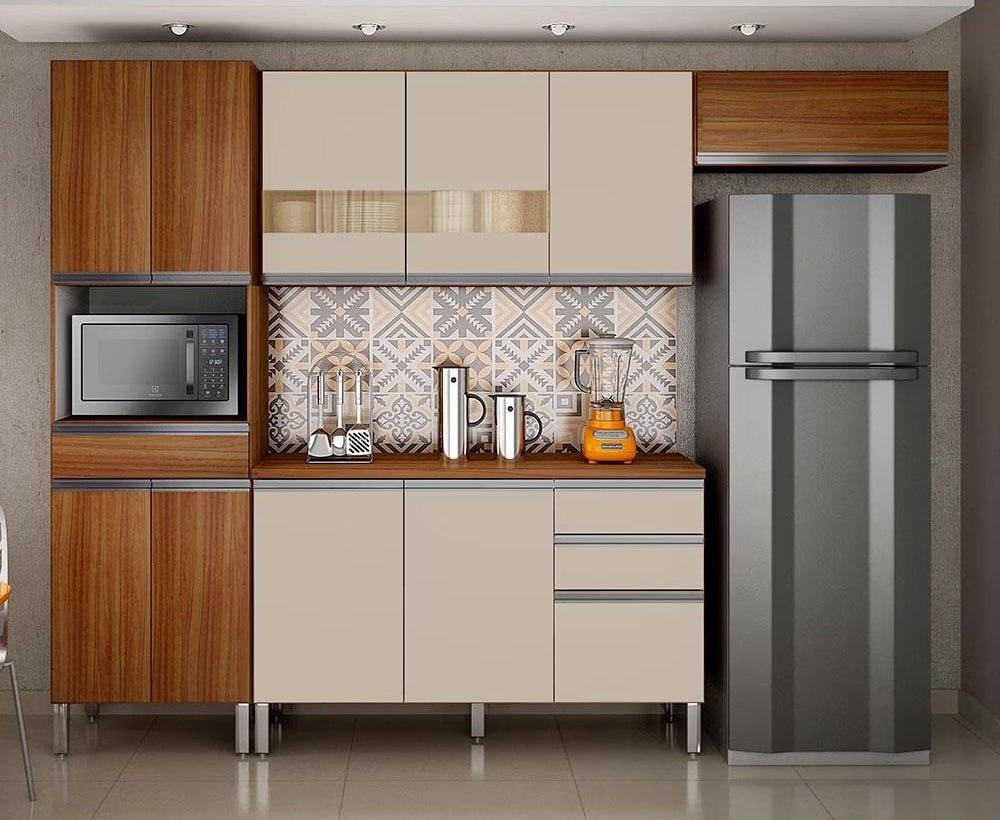 Cozinha Compacta CHF Móveis Turmalina com 11 Portas, 3 Gavetas e 4 Prateleiras – 261cm de largura – Carvalho/Off White