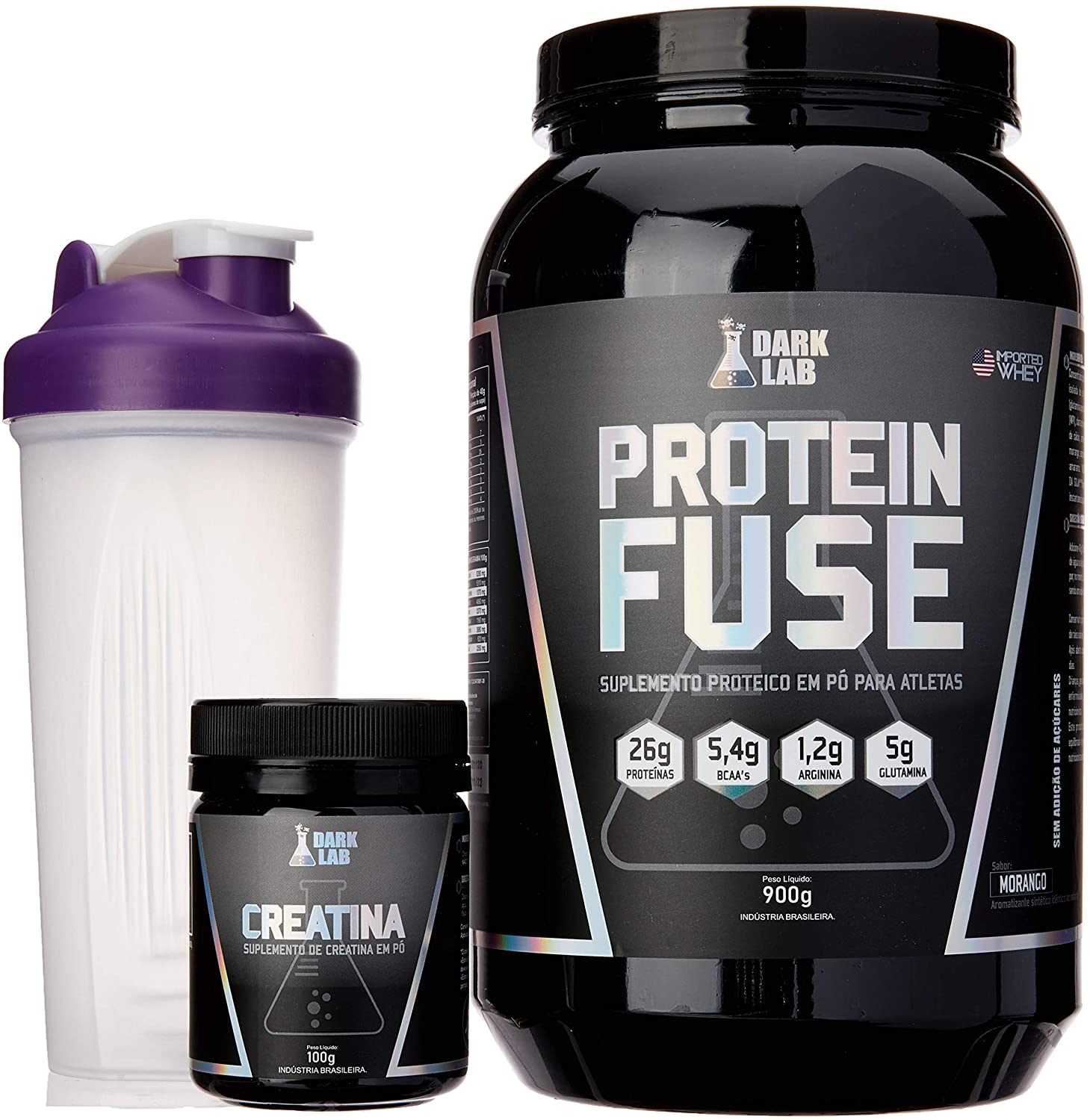 Kit Whey Protein Fuse 900g + Creatina 100g + Coqueteleira Roxa Dark Lab (Morango)