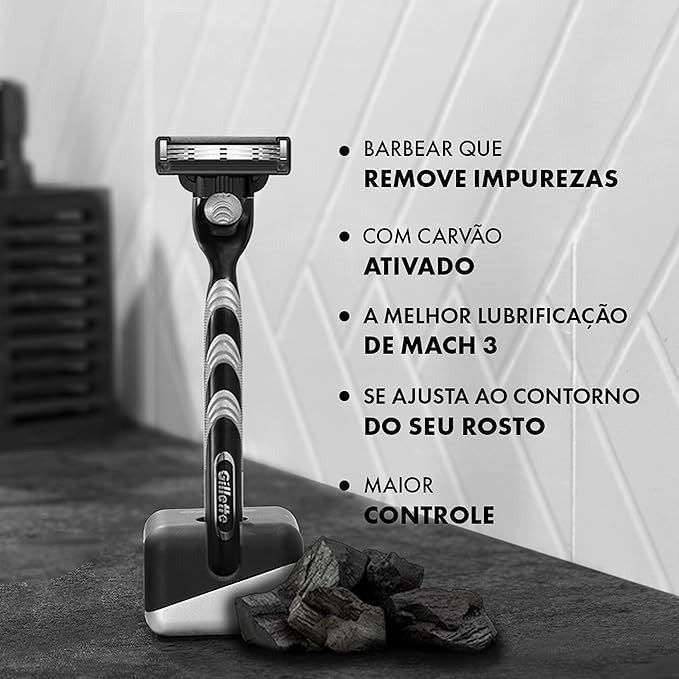 Gillette Mach3 Carbono Aparelho de barbear reutilizável com Carvão Ativado e Fita Lubrificante Melhorada 1 Ud