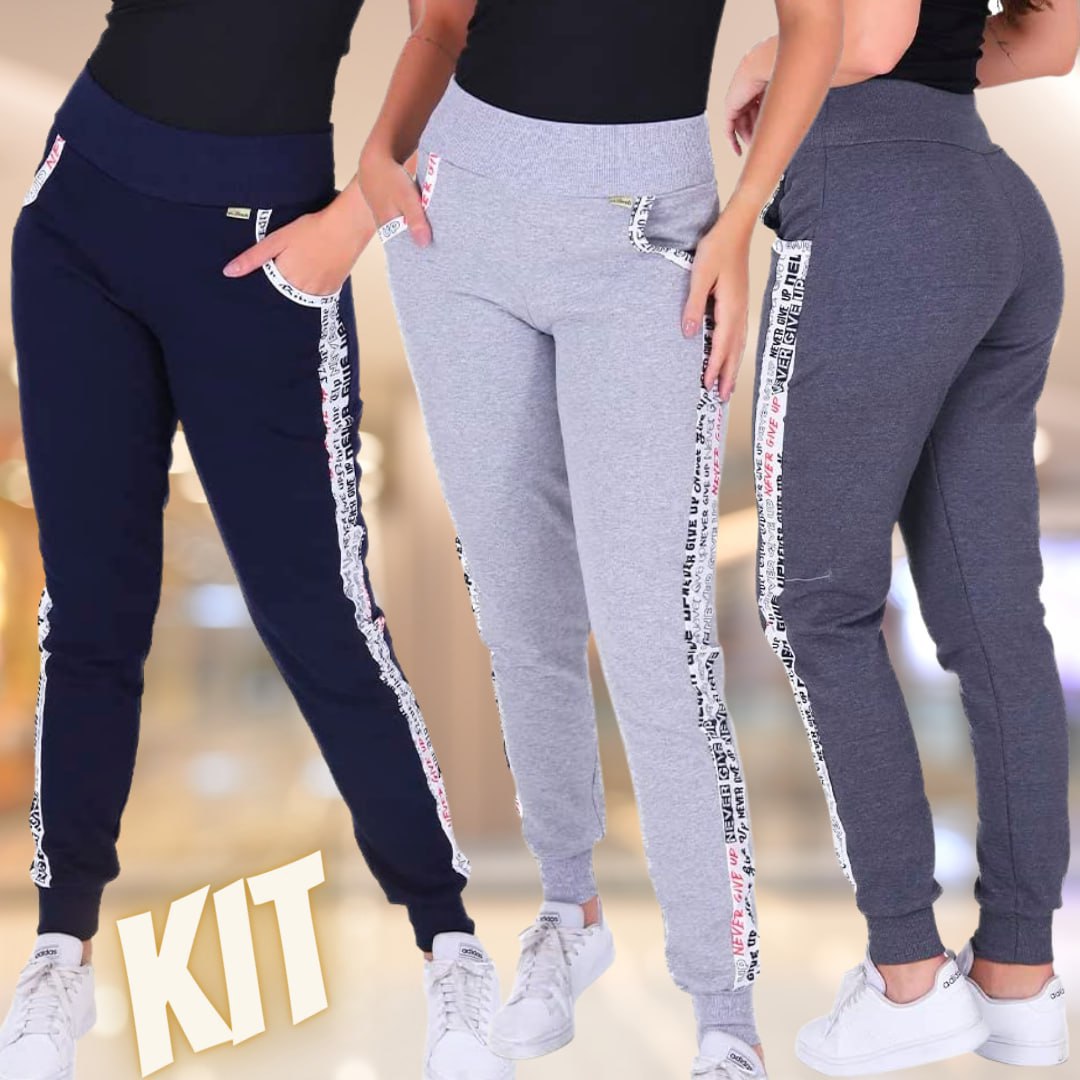 Kit 3 Calças Moletom Femininas Algodão com Bolsos Sport