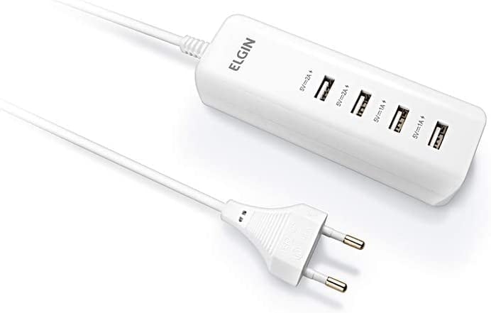 Carregador Múltiplo USB com 4 Saídas 4A, 20 W Cabo AC de 1.5 Metros, Elgin, 46RCT4USB000, Branco