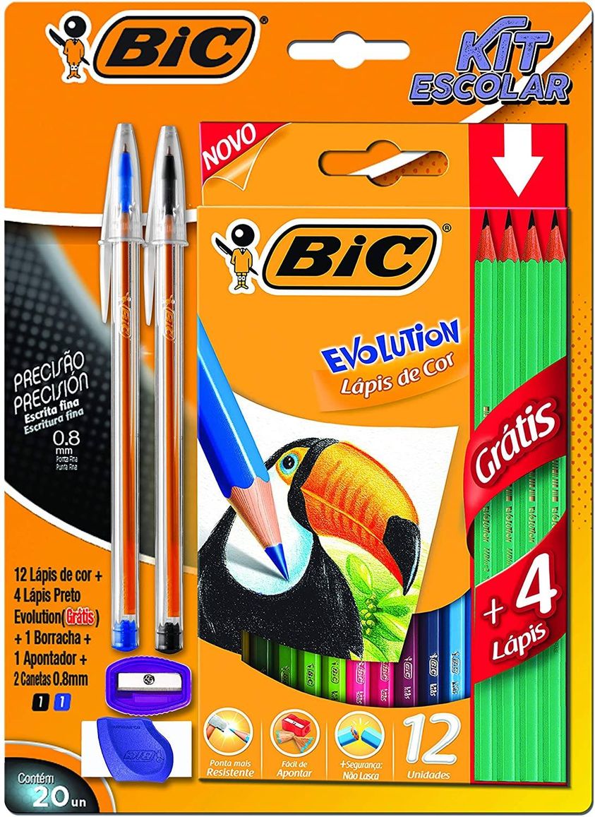 Kit Escolar, BIC, 12 Lápis de Cor + 4 Lápis Preto Evolution + 2 Canetas Cristal Dura + 1 Borracha + 1 Apontador