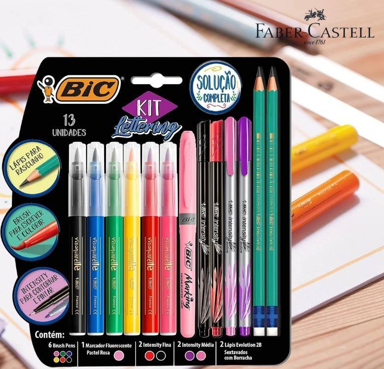 Kit Lettering BIC, c/ 6 Brush Pens + 1 Pincel Marcador Pastel Rosa + 2 Intensity Ponta Fina + 2 Intensiy Ponta Média + 2 Lápis Pretos, 971080, Multicor