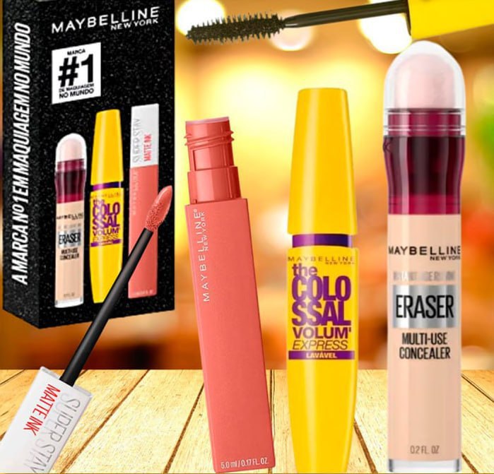 Kit Queridinhos Maybelline NY Batom Líquido Matte ink 65 Seductress + Máscara de Cílios Colossal Lavável + Corretivo Eraser 120 Light