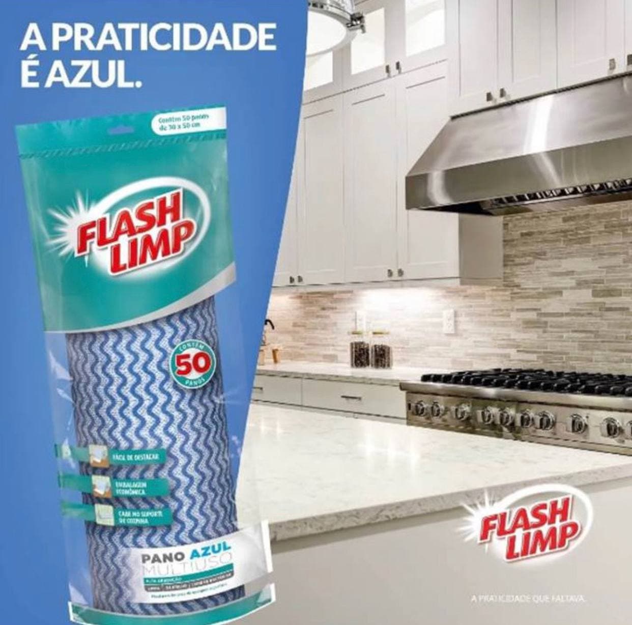 Pano Multiuso Rolo com 50 unidades Lavável e Secagem Rápida, Flash Limp, Azul