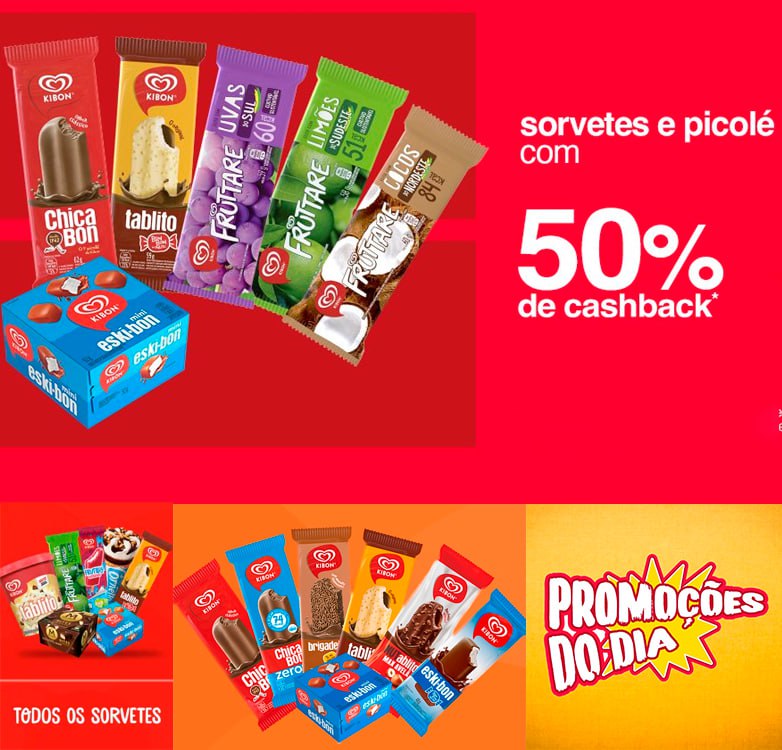 Seleção de picolés e sorvetes Kibon com até 50% cashback na ame
