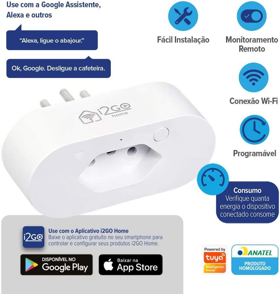 Tomada Inteligente Smart Plug Slim Wi-Fi 10A I2GO Home – Ligue ou Desligue Seus Eletrodomésticos Através do Celular – Compatível com Alexa, I2GWAL035, Branco