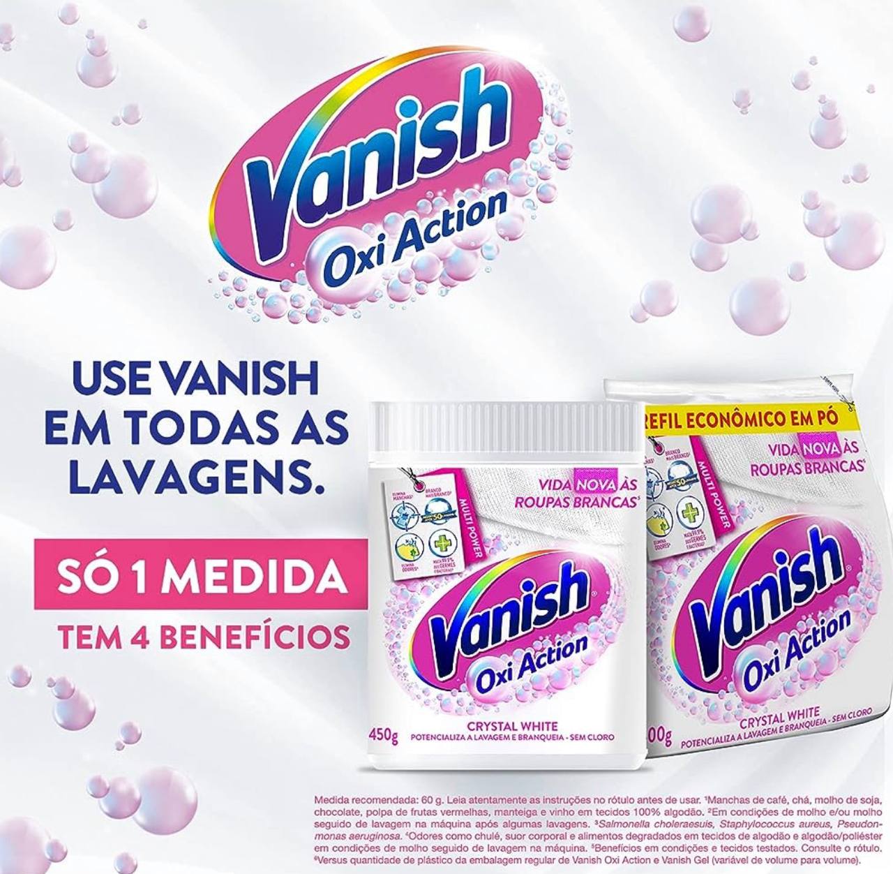 Tira Manchas em Pó Vanish Crystal White Oxi Action 450g para roupas brancas