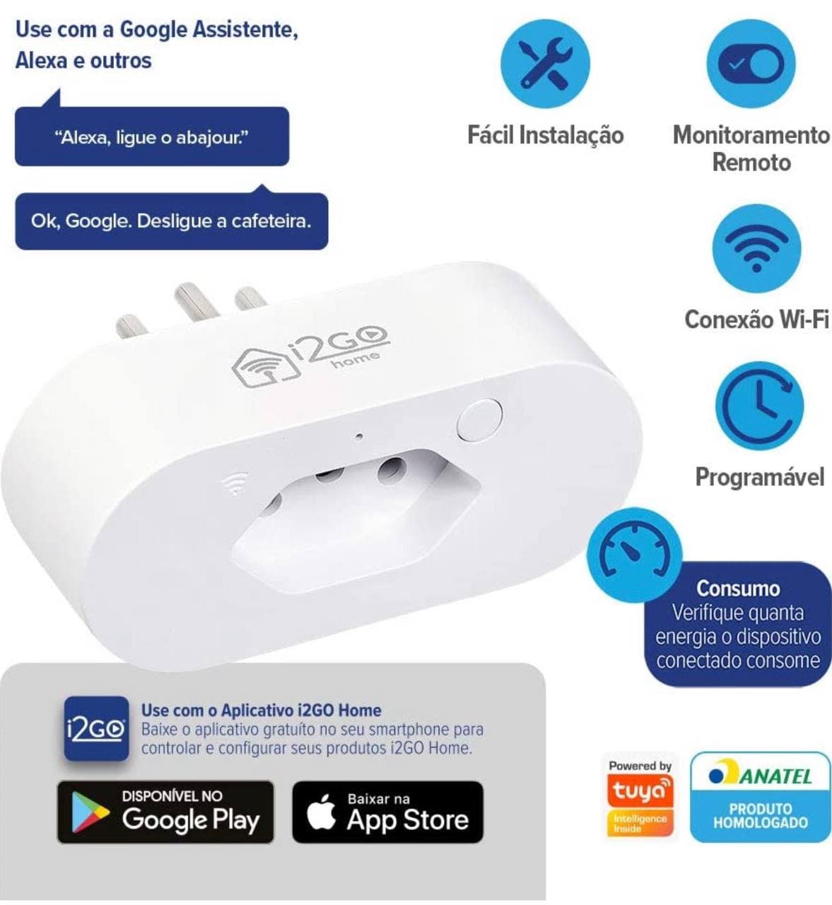 Tomada Inteligente Smart Plug Slim Wi-Fi 10A I2GO Home – Ligue ou Desligue Seus Eletrodomésticos Através do Celular – Compatível com Alexa, I2GWAL035, Branco